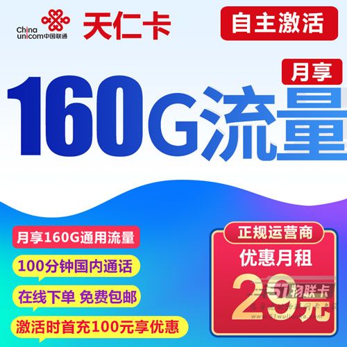 此套餐为联通正规流量卡,月租29元,每月包含160G全通用流量+100分钟通话时长,自主激活。